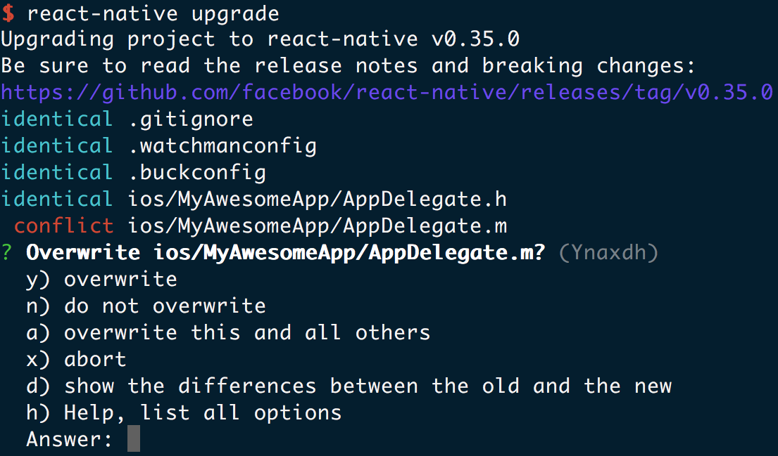 react-native版本。该工具需要比较旧版本与新版本的项目模板才能正常工作。只需在你的应用文件夹里(仍在旧版本时)如上所示运行它即可。