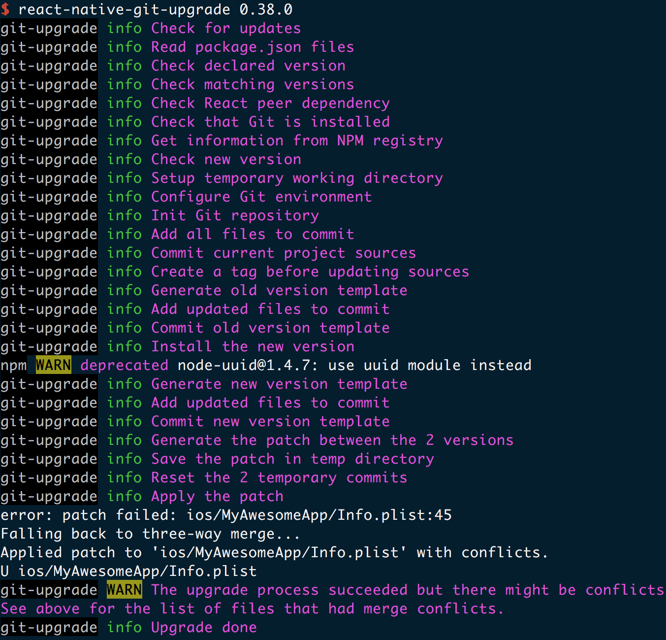 今天我很自豪地介绍一个帮助解决这个问题的新工具。该工具名为 react-native-git-upgrade,它在幕后使用 Git,尽可能自动解决冲突。