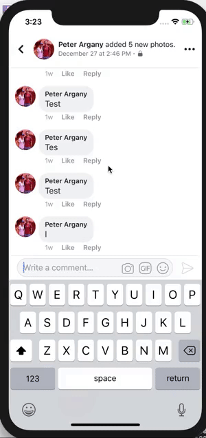 最初搭建这个 API 的想法是监听 NSNotificationCenter 的 UIKeyboardWill(Show/Hide/ChangeFrame) 事件。这种模式在一些开源库和 Facebook App 的部分内部代码中都有使用。不幸的是,UIKeyboardDidChangeFrame 事件在手势滑动时无法及时调用以更新 <InputAccessoryView> 的 frame。此外,键盘高度的变化也未被这些事件捕获。这就导致了如图所示的那类界面异常:
