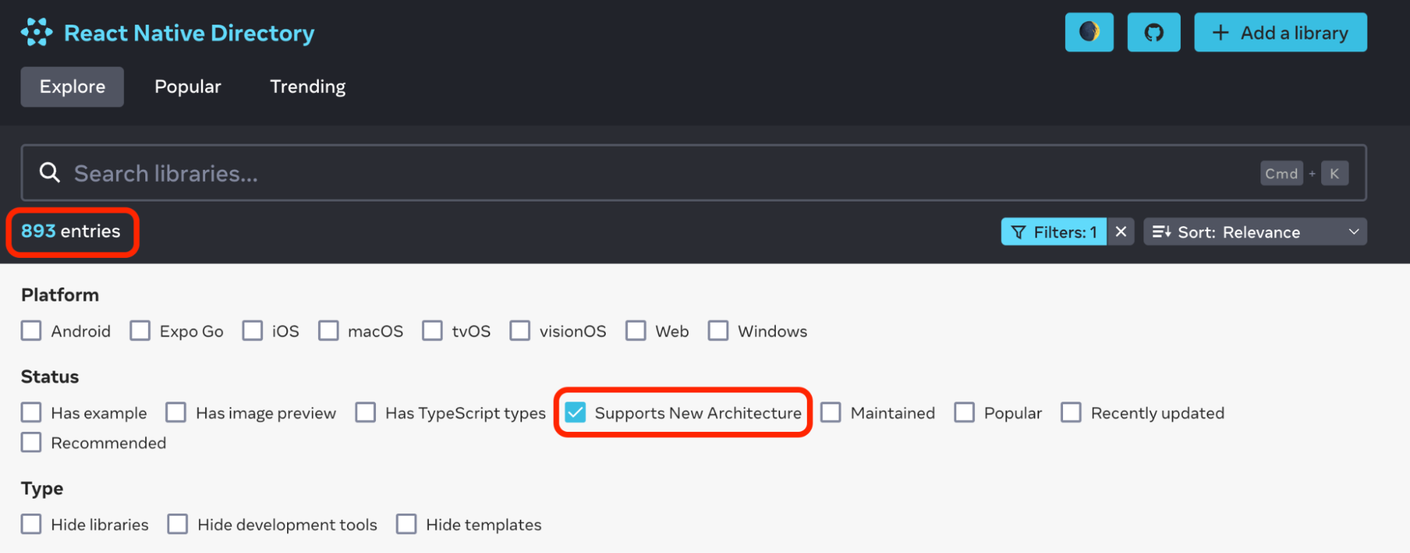 我们与最受欢迎的 React Native 库合作,确保它们支持新架构。您可在 reactnative.directory 网站查看所依赖库的新架构兼容性。