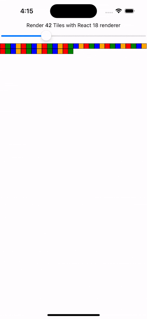下面对比了无过渡的旧架构和带过渡的新架构。假设每个瓦片不是简单的背景色视图,而是包含图像和其他复杂组件的富组件,渲染成本高昂。使用 useTransition 后,您可以避免因更新震荡导致的性能问题,防止落后。