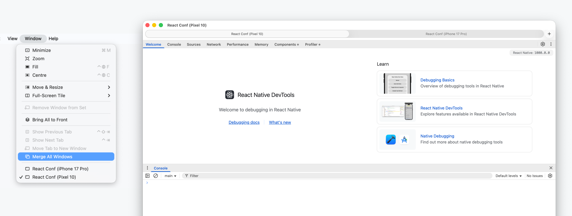 - macOS 上的原生标签页:我们更新了桌面应用以编译为 macOS 26,并为高级用户启用了系统级标签页处理。当打开多个 DevTools 窗口时,可通过 窗口 > 合并所有窗口 访问。